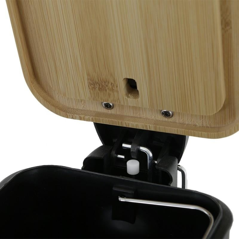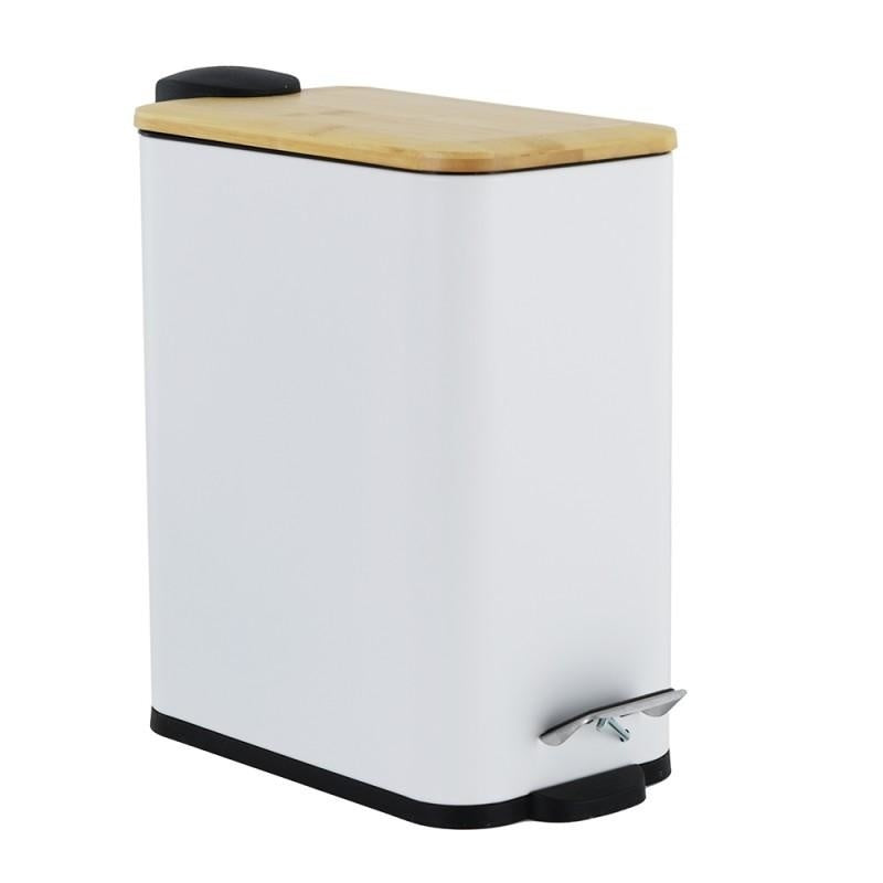 Deze moderne prullenbak is geschikt voor in de badkamer en is gemaakt van gepoedercoat staal en natuurlijk bamboehout. De witte afvalbak heeft een mooie matte afwerking. De deksel is van bamboehout en geeft het geheel een unieke uitstraling. Dankzij het handige pedaal kan je het deksel openen zonder je handen te gebruiken. In de prullenbak zit een zwarte emmer met een praktisch handvat dat het legen van de mand vergemakkelijkt. De basis van het hele product is gemaakt van plastic, dat geen krassen maakt op het vloeroppervlak in de badkamer of toilet. Aan de achterkant van de afvalbak bevindt zich een extra metalen handvat om de pedaalemmer te dragen of aan op te hangen. De inhoud van de prullenbak is 5 liter.